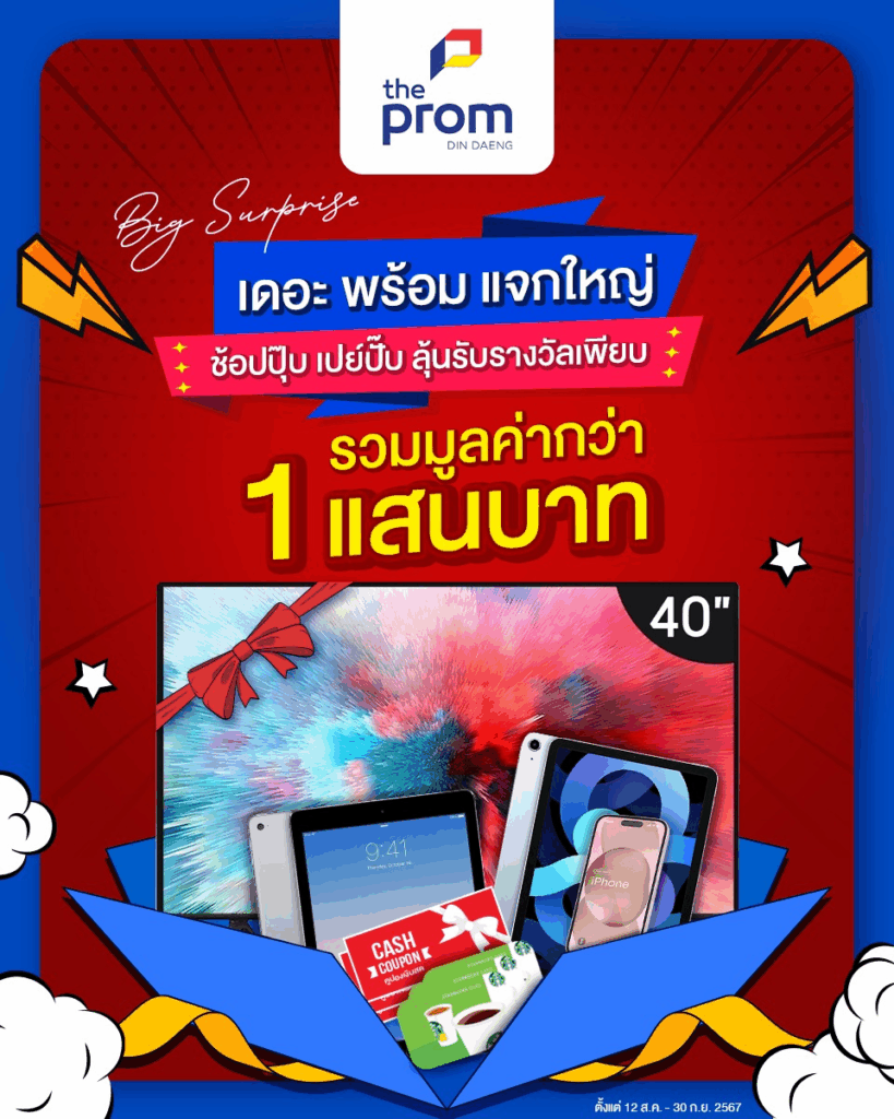 Events กิจกรรมล่าสุด แชร์ปุ๊ป รับปั๊ป ไอศกรีม Mixue รับไอติม Mixue ฟรี! แค่แชร์ครบ 5 คนกดรับโปรใน LINE เดอะพร้อม แชร์ให้เพื่อนครบ 5 คน แสดงคูปองกับพนักงานก็รับไปเลย! ฟรี 1 โคน เฉพาะ Mixue สาขาเดอะพร้อม ดินแดง… Read more กิจกรรมสิ้นสุด ช้อป ชิม ชิล ซัมเมอร์นี้ห้ามพลาด! เตรียมตัวให้พร้อม แล้วมาช้อป ชิม ชิลกันแบบจัดเต็ม! เดอะ พร้อม ดินแดงมีของกินเด็ด ของใช้ดี ดนตรีสดเพลิน ๆ พร้อม… Read more ลุ้นรับของรางวัลวันเด็ก ชวนคุณพ่อคุณแม่พาลูก ๆ มาเดินเล่นที่ “เดอะ พร้อม” ฉลองวันเด็กแห่งชาติ พบกับโปรโมชั่นพิเศษ จากร้านขนมแสนอร่อย ร้านอาหารรสชาติหลากหลาย ที่จะเติมเต็มวันแห่งความสุขของเจ้าตัว… Read more เดอะพร้อม แจกใหญ่ “เดอะ พร้อม” แจกใหญ่ ช้อปปุ๊บ เปย์ปั๊บ ลุ้นรับรางวัลเพียบ! รวมมูลค่ากว่า 1 แสนบาท กติกาง่าย ๆ เพียงแค่ช้อปสินค้าหรือทานอาหารที่ร้านใดก็ได้ ทุก ๆ 200 บาทขึ้นไป / ใบเสร็จ รับทันทีคูปองลุ้นโชค 1 ใบ เพื่อลุ้นรางวัล… Read more EVENTS กิจกรรมล่าสุด รับไอติม Mixue ฟรี! แค่แชร์ครบ 5 คนเฉพาะ Mixue สาขาเดอะพร้อม ดินแดงขั้นตอนง่ายๆ 1. กดรับโปรใน LINE เดอะพร้อม2. แชร์ให้เพื่อนครบ 5 คน3. แสดงคูปองกับพนักงานก็รับไปเลย! เริ่มวันที่ 12 ส.ค. – 30 พ.ย. 2568คลิกที่นี่ https://lin.ee/4wamJRR กิจกรรมสิ้นสุด ซัมเมอร์นี้ห้ามพลาด! เตรียมตัวให้พร้อม แล้วมาช้อป ชิม ชิลกัน มีของกินเด็ด ของใช้ดี ดนตรีสดเพลิน ๆ พร้อมบรรยากาศสุดคูลมาให้คุณได้เพลิดเพลิน ไม่ว่าจะมากับเพื่อน แฟน หรือครอบครัวก็ดีต่อใจสุด ๆวันที่ 26 – 27 เมษายน 2568 16.00 – 24.00 น. ฉลองวันเด็กแห่งชาติ เพียงแค่คุณพ่อคุณแม่แอด LINE@ : @thepromdindaeng ก็รับสิทธิ์ หมุนวงล้อจับรางวัล ลุ้นของขวัญสุดน่ารักจาก “เดอะ พร้อม” รวมมูลค่ากว่า 1 หมื่นบาท* ให้เด็ก ๆ ทันที! พบกันวันที่ 10-11 ม.ค. 2568 เดอะ พร้อม แจกใหญ่ ช้อปปุ๊บ เปย์ปั๊บกติกาง่าย ๆ เพียงแค่ช้อปสินค้าหรือทานอาหารที่ร้านใดก็ได้ ทุก ๆ 200 บาทขึ้นไป / ใบเสร็จ รับทันทีคูปองลุ้นโชค 1 ใบ เพื่อลุ้นรางวัลใหญ่ iPhone, iPad, ทีวี 40 นิ้ว และอื่นๆ อีกมากมาย ตั้งแต่วันที่ 12 ส.ค. – 30 ก.ย. 2567 **คูปองลุ้นโชคเพียง 5,000 ใบเท่านั้น**